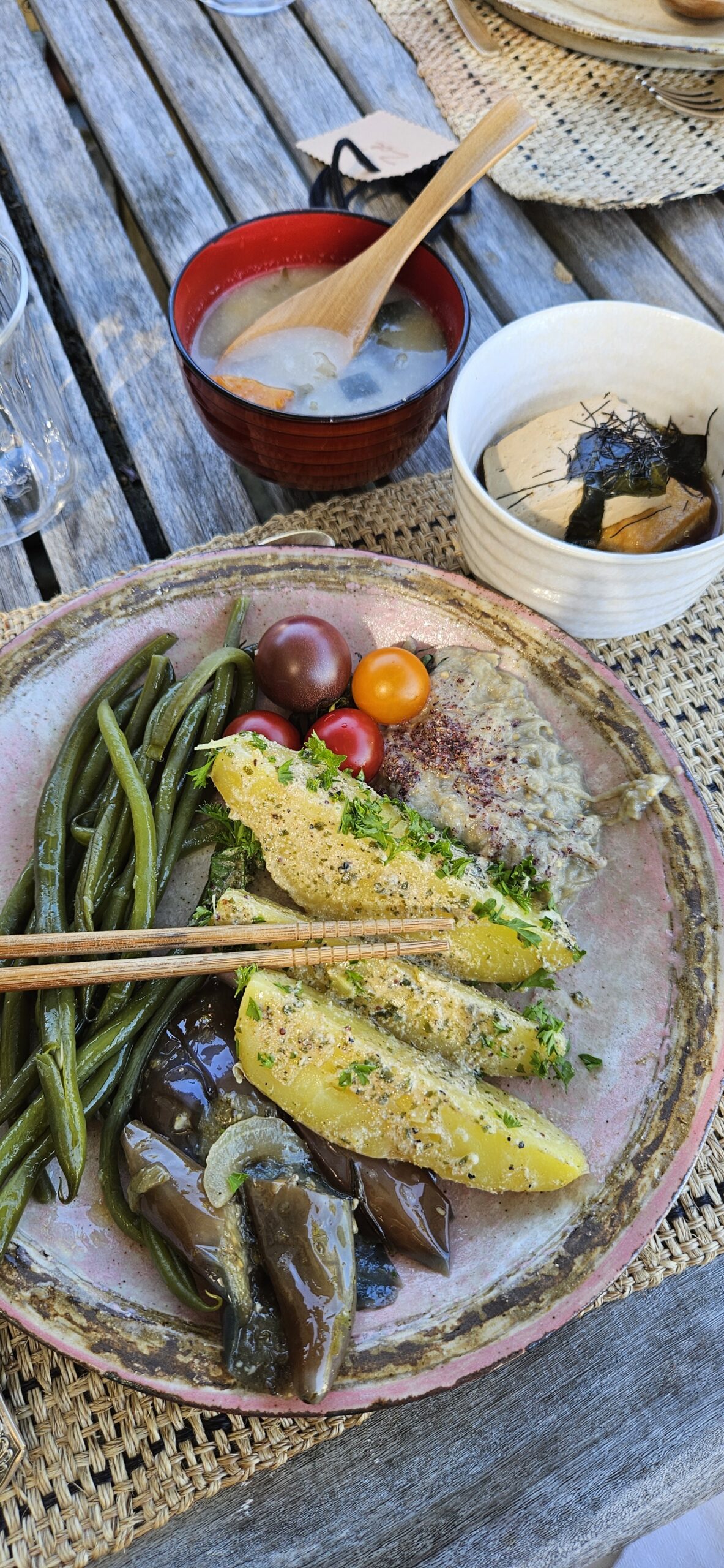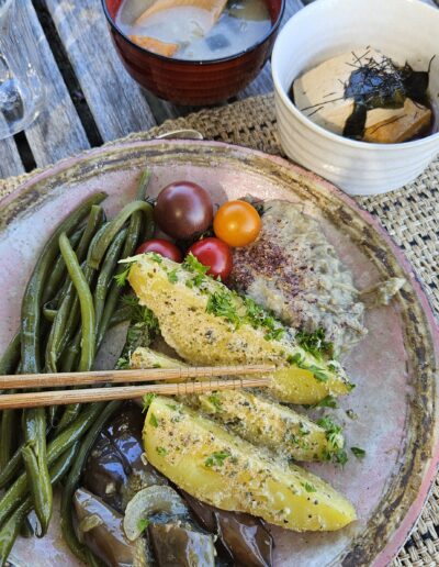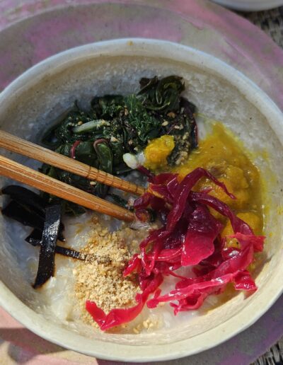 Les repas sont composés par le chef, passionné de cuisine japonaise qu’il revisite avec des produits locaux en version végétarienne : gourmandise et découverte des sens assurée.